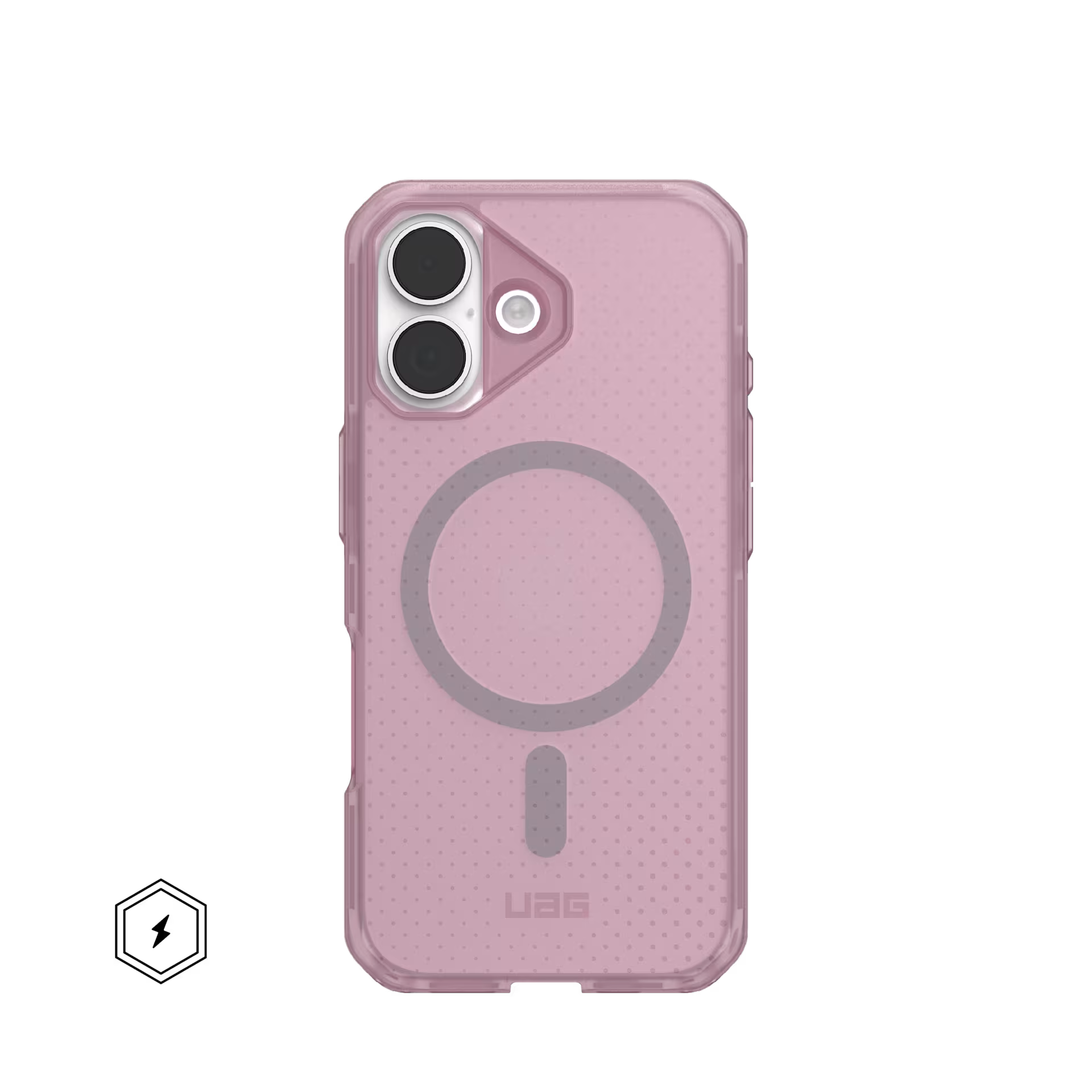 The Dot series is a translucent lightweight case with exceptional military drop protection you trust and love from UAG. Crafted with a rugged co-mold of translucent PC and TPU, it features an advanced impact-resistant core and a raised protective screen surround to guard your device against drops and scratches. Our integrated magnet module locks your device securely in place when using wireless chargers or other magnetic accessories. Features an enhanced textured anti-slip traction grip that ensures a secure hold reducing the chance of accidental drops.