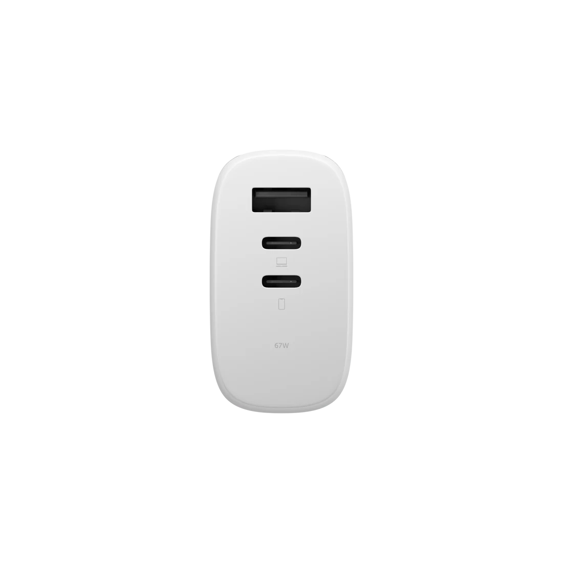 Features | Charge up to 3 devices with 2 USB-C ports & 1 USB-A port Advanced 67W GaN technology for faster, smaller, and lighter charging 67W PD-enabled USB-C port powers a MacBook Pro 14"" or charges iPhone to 50% in 30 mins Universal charger with US/CA, EU & UK adapters Built-in protection from overvoltage, overcurrent & overheating |