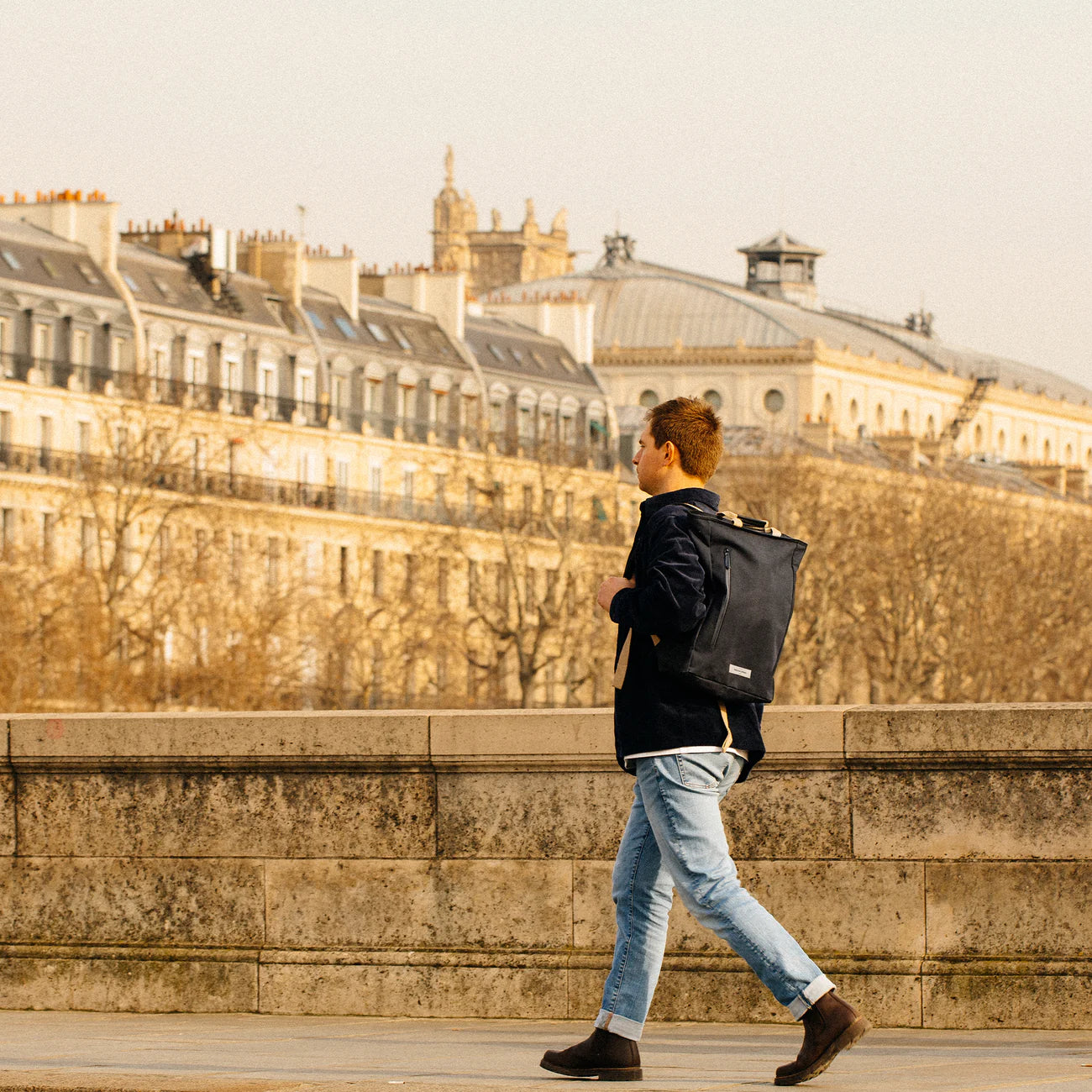 Inspired by the sleek silhouette of classic roll-top bags, reimagined with easier access, clever organization, and sustainable and durable materials, and designed with the digital lifestyle in mind.
