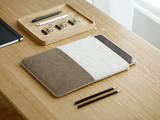 Our iPad case was designed simply and in the spirit of convenience and practicality. Its muted color palette and ecological materials – wool felt and washpapa – situate it firmly within Oakywood’s ethos of minimalist aesthetic, durability, and ease of use.