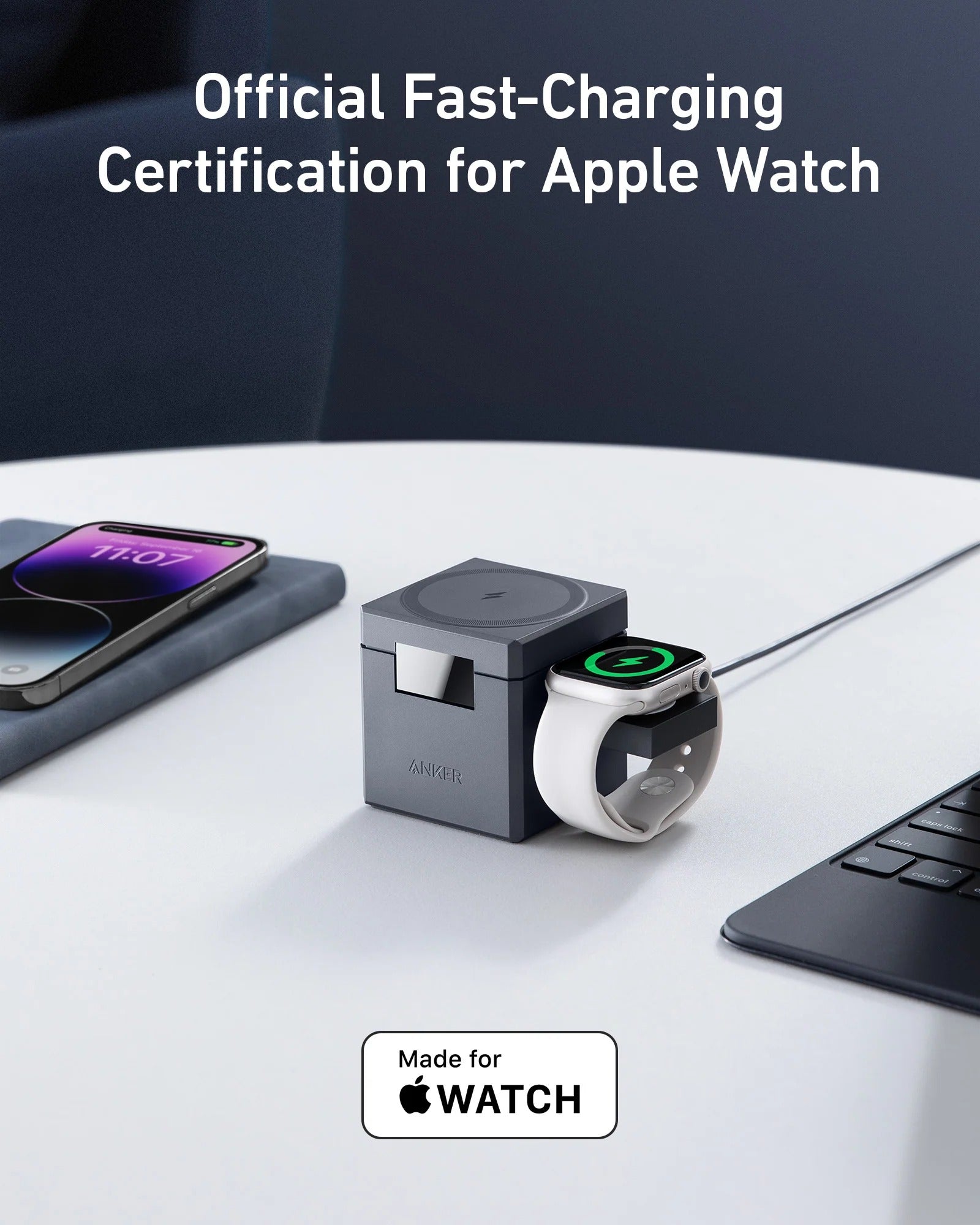 Anker 3-in-1 Cube is not only for your iPhone—it's also officially certified for Apple Watch fast charging. Seamlessly power up your Apple Watch Ultra / 10 / 9 / 8 / 7 series with the quick charging feature, so your watch is ready when you are.